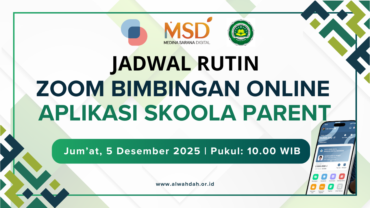 <p>Selamat pagi pak Bapak dan Ibu Wali Santri PPSG AL-WAHDAH , kami akan mengadakan zoom terbuka untuk Wali Santri yang masih gagal login atau ingin tau lebih lanjut mengenai aplikasi skoola parent di hari Jumat, 5 Desember 2025 pukul 10.00 WIB dengan link sebagai berikut :</p><p>Topik: Pelatihan Skoola Parent PPSG AL WAHDAH<br>Waktu: 5 Des 2025 10:00 WIB<br>Bergabung ke Rapat Zoom<br>https://us02web.zoom.us/j/84864791301?pwd=5VXVVC723S9yoIKfGiyVaZzxUWejOD.1</p><p>ID Rapat: 848 6479 1301<br>Kode Sandi: 819944</p><p>Simpan dan tandai link ini agar besok tidak lupa dan bisa mengikuti pelatihannya, atas perhatiannya kami ucapkan terima kasih🙏</p>