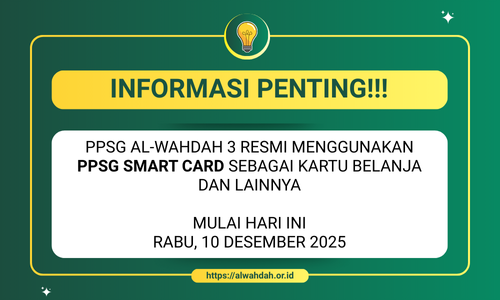 <p>Assalamu’alaikum Warahmatullahi Wabarakatuh.</p><p>Diberitahukan kepada <strong>seluruh santri dan wali santri Al-Wahdah 3</strong> bahwa <strong>penggunaan PPSG Smart Card telah resmi diberlakukan</strong> di lingkungan PPSG Al-Wahdah 3. Kartu ini berfungsi sebagai:</p><ol><li>Kartu absensi santri</li><li>Akses layanan pesantren</li><li>Administrasi internal</li><li><strong>Kartu belanja di koperasi/kantin pesantren</strong></li></ol><p>Seluruh santri <strong>wajib membawa dan menggunakan PPSG Smart Card</strong> dalam kegiatan sehari-hari.</p><p>Demikian informasi ini disampaikan untuk menjadi perhatian bersama.</p><p>Wassalamu’alaikum Warahmatullahi Wabarakatuh</p><p> </p><p><strong>Pengasuh PPSG Al-Wahdah</strong></p>